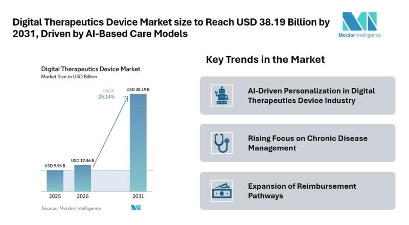 According to Mordor Intelligence, the digital therapeutics device market size [https://www.mordorintelligence.com/industry-reports/digital-therapeutic-devices-market?utm_source=abnewswire] is expected to grow from USD 9.96 billion in 2025 to USD 12.46 billion in 2026, and further reach USD 38.19 billion by 2031, registering a CAGR of 25.14% during the forecast…