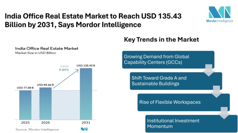 According to Mordor intelligence, the India office real estate market size [https://www.mordorintelligence.com/industry-reports/india-office-real-estate-market?utm_source=abnewswire] in 2026 is estimated at USD 84.66 billion, growing from USD 77.08 billion in 2025, and is projected to reach USD 135.43 billion by 2031, growing at a CAGR…