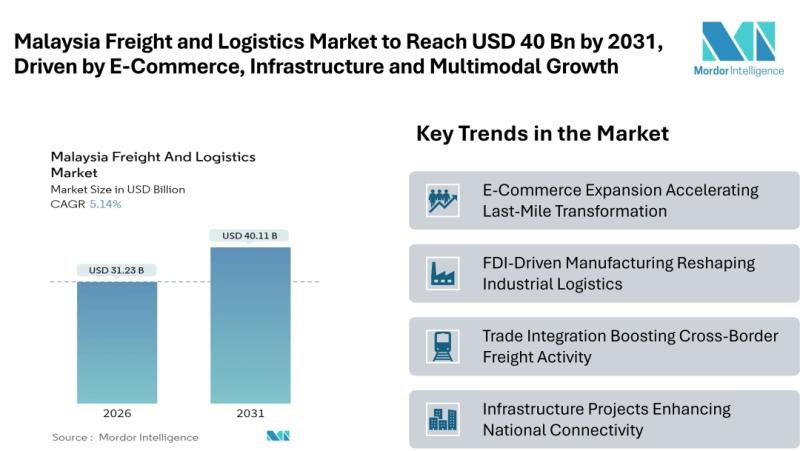 According to Mordor Intelligence, the Malaysia freight and logistics market size [https://www.mordorintelligence.com/industry-reports/malaysia-freight-logistics-market-study?utm_source=abnewswire] is on a steady growth trajectory, expanding from USD 29.70 billion in 2025 to USD 31.23 billion in 2026, and projected to reach USD 40.11 billion by 2031, advancing…