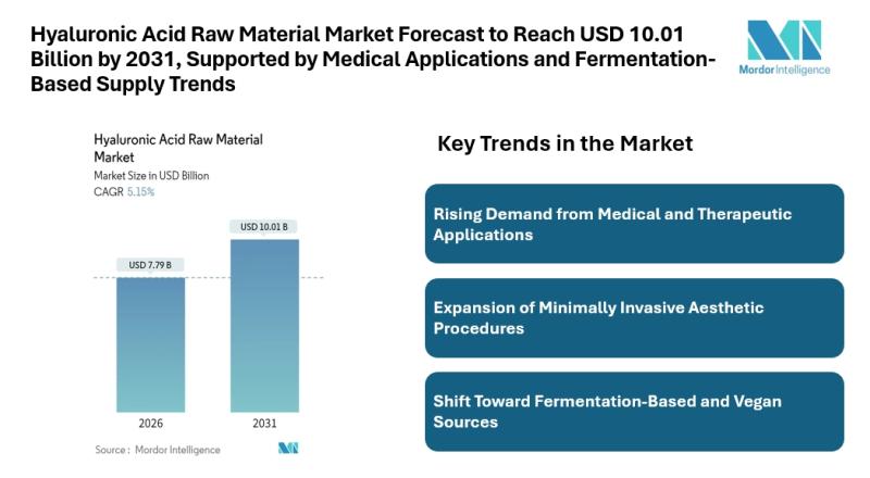 According to Mordor Intelligence, the hyaluronic acid raw material market size [https://www.mordorintelligence.com/industry-reports/hyaluronic-acid-raw-material-market?utm_source=abnewswire] was valued at USD 7.79 billion in 2026 , reaching USD 10.01 billion by 2031. This growth outlook reflects the increasing reliance on hyaluronic acid as a functional raw…