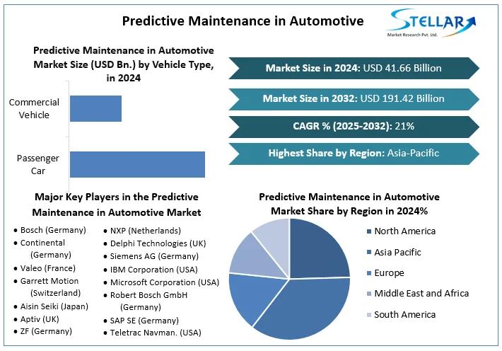 Predictive Maintenance in Automotive Market size was valued at USD 41.66 Billion in 2024 and the total Predictive Maintenance in Automotive Market revenue is expected to grow at 21% through 2025 to 2032, reaching nearly USD 191.42 Billion.