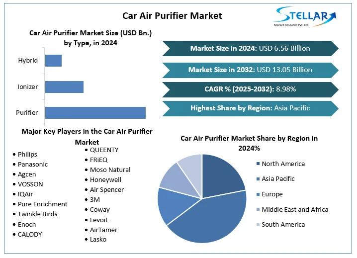 Car Air Purifier Market size was valued at USD 6.56 Bn. in 2024 and the total Car Air Purifier Market size is expected to grow at a CAGR of 8.98% from 2025 to 2032, reaching nearly USD 13.05 Bn. by 2032.