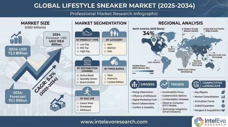 The Lifestyle Sneaker Market is estimated at USD 72.1 billion in 2024 and is on track to reach roughly USD 119.6 billion by 2034, implying a compound annual growth rate of 5.2% over 2025-2034. This growth is driven by the convergence of fashion, sportswear, and street culture, with sneakers increasingly positioned as everyday lifestyle essentials rather than purely athletic footwear. Rising influence of social media, celebrity collaborations, and limited-edition drops…