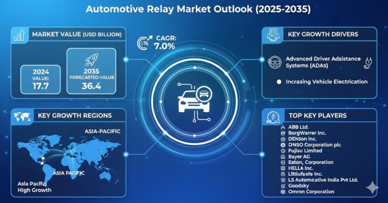 The global Automotive Relay Market is projected to reach a valuation of USD 36.4 billion by 2036, climbing from USD 17.7 billion in 2026. Expanding at a compound annual growth rate (CAGR) of 7.0%, the market is fueled by the rapid surge in electric vehicle (EV) production and the integration of advanced driver assistance systems (ADAS). As the industry shifts toward autonomous and connected mobility, the demand for high-performance relays…