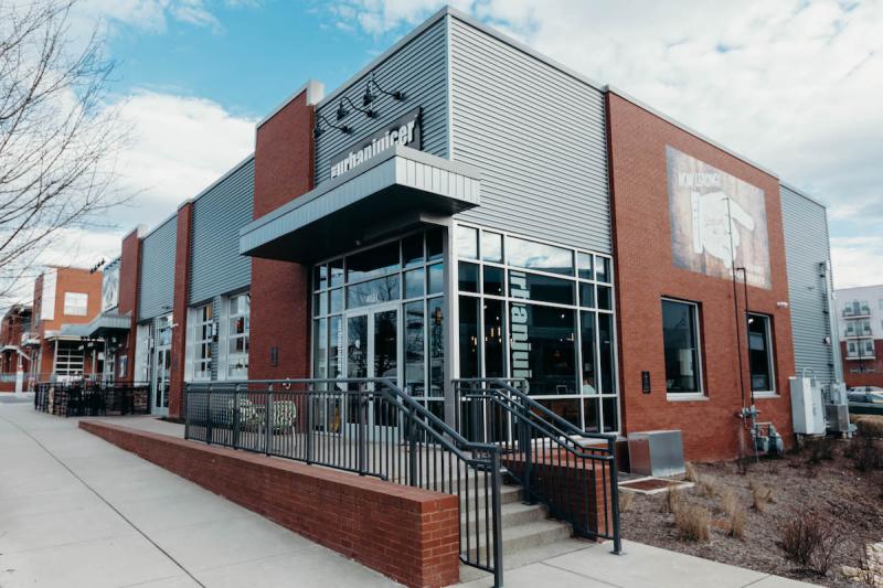 Modern storefront for Urban Juicer featuring sleek industrial brick and metal by Design Build Partners.