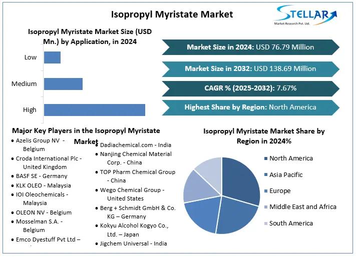 The Isopropyl Myristate Market size was valued at USD 76.79 Mn. in 2024 and the total Isopropyl Myristate Market size is expected to grow at a CAGR of 7.67% from 2025to 2032, reaching nearly USD 138.69 Mn. by 2032.