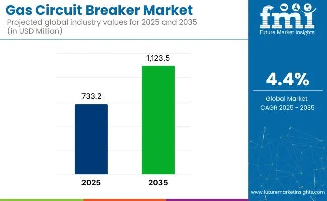 The global Gas Circuit Breaker Market is witnessing steady expansion as utilities and governments intensify investments in modern power infrastructure. Estimated at USD 733.2 million in 2025, the market is projected to reach USD 1,123.5 million by 2035, registering a CAGR of 4.4%. This growth reflects rising electricity demand, grid modernization initiatives, and the increasing complexity of power transmission networks.