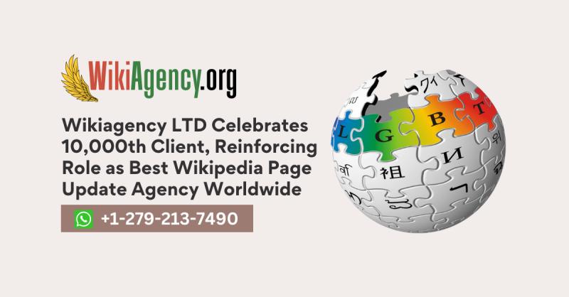 Wikiagency LTD, a reliable Wikipedia page creation and editing agency, proudly announces the achievement of a significant milestone: serving its 10,000th client for Wikipedia page updating services. This accomplishment underscores the company's position as the leading Wikipedia page update agency globally, renowned for its expert services in Wikipedia page creation, editing, updates, notability, SEO optimization, image management, monitoring, maintenance, tag removal, deleted page recovery, and translation.
