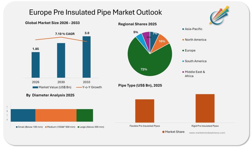The Europe pre insulated pipe market is currently positioned as a critical enabler of energy-efficient infrastructure, supporting district heating, cooling, and various industrial applications. As of 2026, the market is valued at USD 1.85 billion, with robust growth projected through 2033. The sector's expansion is underpinned by increasing regulatory focus on thermal efficiency, decarbonization targets, and the modernization of aging utility networks across the region.
