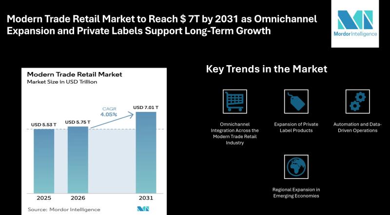According to Mordor Intelligence, the modern trade retail market size is projected to increase from USD 5.53 trillion in 2025 to USD 5.75 trillion in 2026, reaching USD 7.01 trillion by 2031 at a CAGR of 4.05%. This market forecast reflects…