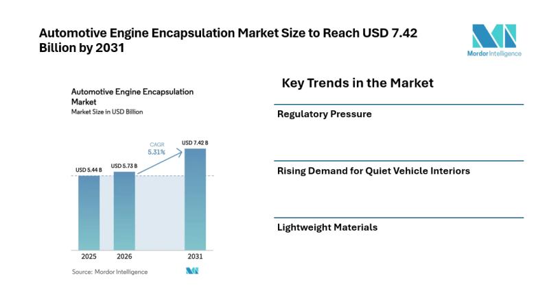 According to Mordor Intelligence, the automotive engine encapsulation market size is projected to grow from USD 5.44 billion in 2025 to USD 5.73 billion in 2026, reaching USD 7.42 billion by 2031. The report notes that the market is expected to expand at a CAGR of 5.31% during the forecast period from 2026 to 2031.