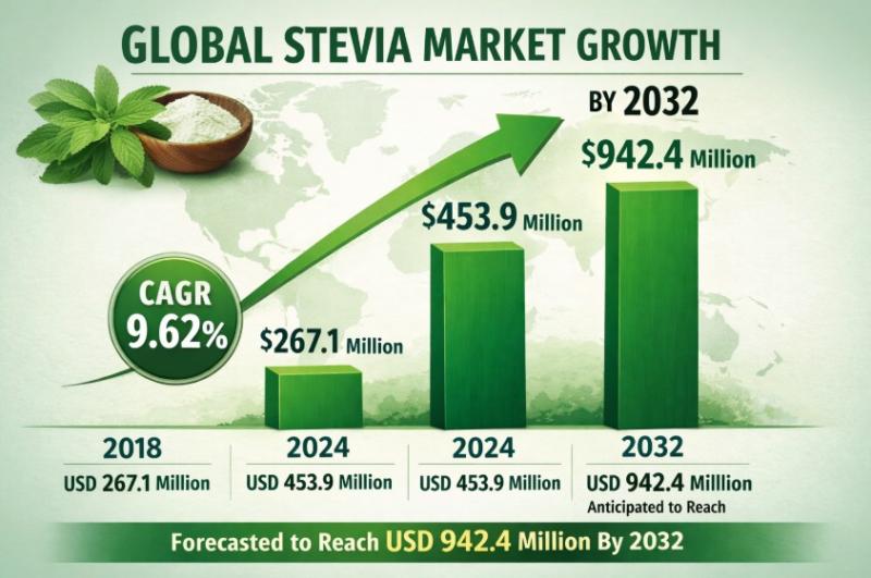 The global stevia market has undergone substantial transformation over the past decade, evolving from a niche natural sweetener segment into a strategically important component of the broader sugar reduction and clean-label movement. The market, valued at USD 267.1 million in 2018, expanded to USD 453.9 million by 2024 and is projected to reach USD 942.4 million by 2032. This trajectory reflects…