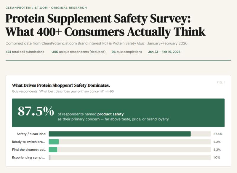Limitations: Self-selected visitors to CleanProteinList.com; skews toward safety-motivated consumers. Poll unique count is an estimate. Cross-tabulation subgroups are small; findings are directional. Data current as of February 19, 2026; collection ongoing.