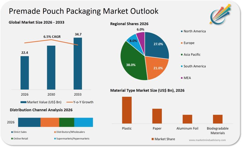The premade pouch packaging market is positioned as a dynamic segment within the global packaging industry, characterized by increasing adoption across food, beverage, personal care, and pharmaceutical sectors. As of 2026, the market is valued at USD 22.4 billion, with robust growth anticipated through 2033. The shift toward lightweight, resealable, and customizable packaging formats is accelerating, supported by evolving consumer preferences and heightened sustainability requirements.