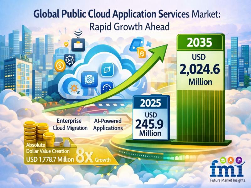 The global Public Cloud Application Services Market is entering a high-growth phase, projected to expand from USD 245.9 million in 2025 to USD 2,024.6 million by 2035, registering a remarkable CAGR of 23.5%. The market is set to create an absolute dollar opportunity of USD 1,778.7 million, reflecting an 8x growth trajectory driven by enterprise cloud migration, AI-powered applications, and increasing demand for agile IT ecosystems.