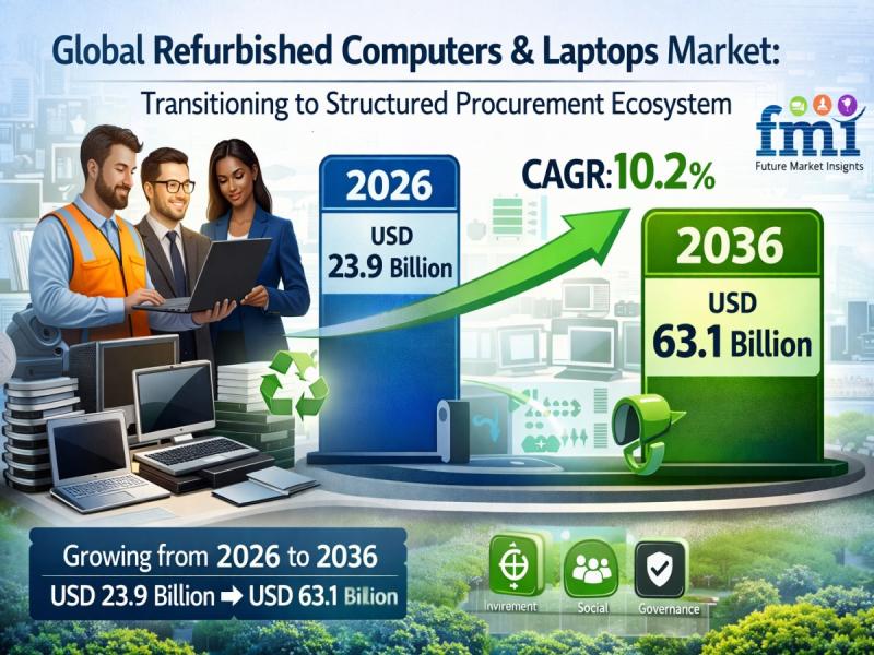 The global refurbished computers and laptops market is entering a decisive growth phase, transitioning from opportunistic resale to a structured, policy-driven procurement ecosystem. According to the latest industry analysis, the market is projected to grow from USD 23.9 billion in 2026 to USD 63.1 billion by 2036, expanding at a robust CAGR of 10.2% over the forecast period.