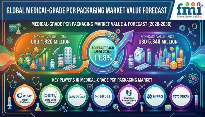 The global medical-grade post-consumer recycled (PCR) packaging market is entering a decisive growth phase, driven not by sustainability narratives alone but by rigorous compliance frameworks and validation-led procurement strategies. Valued at USD 1,920 million in 2026, the market is projected to reach USD 5,840 million by 2036, expanding at a robust CAGR of 11.8%, according to recent market analysis.