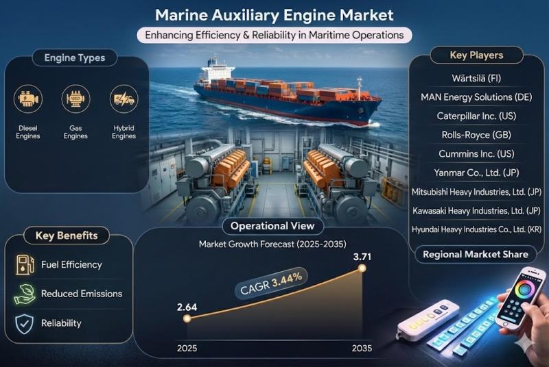 Marine Auxiliary Engine Market: Powering Shipboard Operations with Efficiency and InnovationThe Marine Auxiliary Engine Market is poised for measured growth as maritime industries emphasize energy efficiency, stricter emissions standards, and reliable onboard power solutions. Auxiliary engines - essential for powering electrical systems, pumps, ballast operations, emergency power, and other non-propulsion functions - are fundamental to vessel performance, safety, and operational continuity. According to Market Research Future (MRFR) analysis, the marine auxiliary engine market was valued at approximately USD 2.56 million in 2024 and is expected to grow to around USD 2.64 million in 2025. Over the long term, the sector is projected to expand to about USD 3.71 million by 2035, registering a compound annual growth rate (CAGR) of 3.44% from 2025 to 2035 - reflecting steady demand across commercial, fishing, and recreational marine applications.