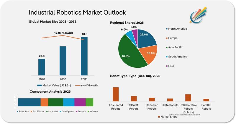 The industrial robotics market is experiencing a period of robust expansion, underpinned by escalating automation initiatives across manufacturing, logistics, and automotive sectors. As of 2026, the market is valued at USD 20.8 billion, with projections indicating a significant rise to USD 48.3 billion by 2033. This growth trajectory is driven by the convergence of advanced robotics technologies, increasing labor cost pressures, and the pursuit of operational efficiency.…