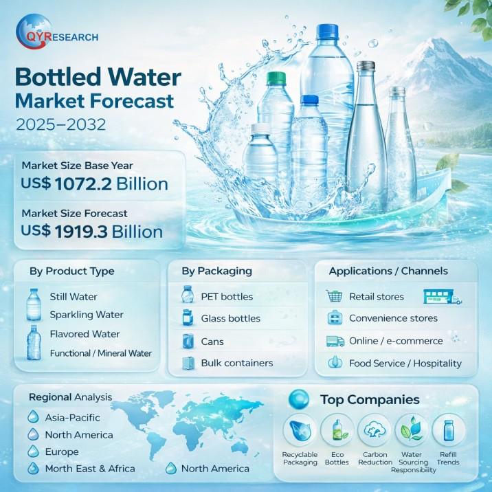 Market Overview and Research Scope - The global Bottled Water market was valued at US$ 1072.2 billion in 2025 and is projected to reach US$ 1919.33 billion by 2032, registering a CAGR of 8.8% during the forecast period. Bottled water remains one of the fastest-growing segments within the global beverage industry, driven by increasing awareness of hydration, health, and water safety. Consumers are shifting away from sugary beverages toward healthier alternatives, positioning