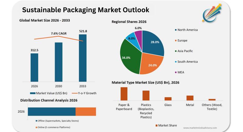 According to Market Minds Advisory, the sustainable packaging market is undergoing a significant transformation, driven by mounting environmental concerns and evolving regulatory frameworks. In 2026, the market is projected to reach USD 312.5 billion, with robust growth anticipated through 2033 as sustainability becomes a central pillar of packaging strategies across industries. The sector's momentum is underpinned by rapid advances in biodegradable materials, recyclable polymers, and circular economy models, which are…
