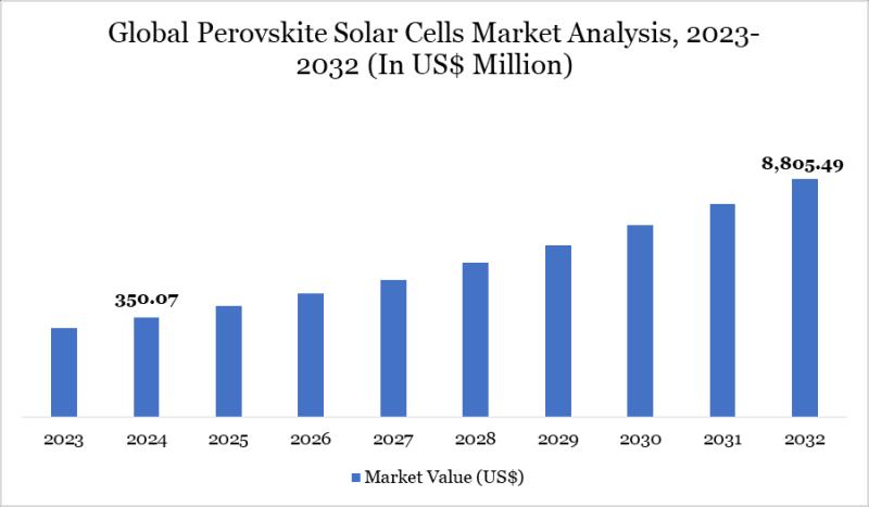 The Global Perovskite Solar Cells Market size reached US$ 350.07 million in 2024 and is expected to reach US$ 8,805.49 million by 2032, growing with a CAGR of 38.05% during the forecast period 2025-2032.