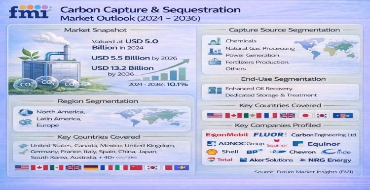 The global carbon capture and sequestration (CCS) market is entering a decisive growth phase, transitioning from oil-linked recovery economics to policy-supported dedicated storage models. According to the latest analysis by Future Market Insights (FMI), the market was valued at USD 5.0 billion in 2025 and is projected to grow to USD 5.5 billion in 2026, reaching USD 13.2 billion by 2036, expanding at a 10.1% CAGR over the forecast period.