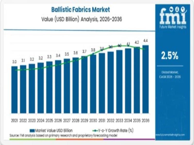 The global ballistic fabrics market was valued at USD 3.3 billion in 2025 and is estimated to reach USD 3.4 billion in 2026. According to analysis by Future Market Insights, demand is projected to expand to USD 4.3 billion by 2036, reflecting a CAGR of 2.5% during the forecast period.