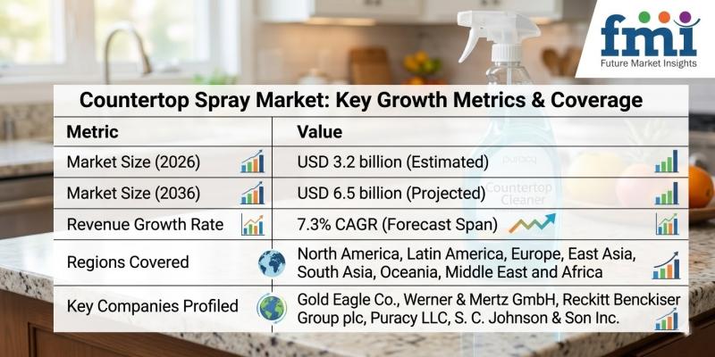 The global Countertop Spray Market is entering a new growth phase as hygiene awareness, urban living patterns, and evolving cleaning habits reshape consumer demand worldwide. According to recent market analysis, the industry recorded USD 3.0 billion in 2025 and is expected to reach USD 3.2 billion in 2026, expanding to USD 6.5 billion by 2036, representing a compound annual growth rate (CAGR) of 7.3% during the forecast period.