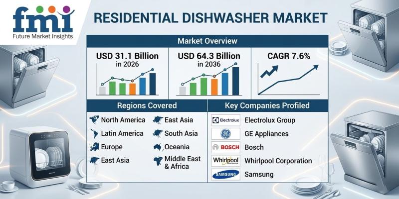 The global Residential Dishwasher Market is entering a new era of technology-driven growth as households increasingly prioritize automation, hygiene, and energy efficiency in modern kitchens. According to new industry analysis, the market is valued at USD 31.1 billion in 2026 and is projected to reach USD 64.3 billion by 2036, expanding at a compound annual growth rate (CAGR) of 7.6% over the forecast period.