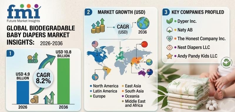 The global Biodegradable Baby Diapers Market is entering a period of accelerated expansion as environmentally conscious parenting and dermatological safety concerns reshape the infant hygiene industry. According to the latest analysis by Future Market Insights (FMI), the market is expected to grow from USD 4.9 billion in 2026 to USD 10.8 billion by 2036, registering a compound annual growth rate (CAGR) of 8.2% during the forecast period.