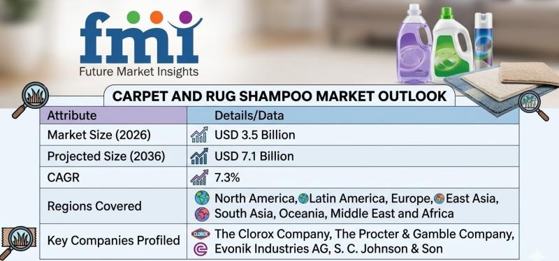 The global Carpet and Rug Shampoo Market is entering a period of sustained growth as households and commercial facilities prioritize deeper cleaning and longer carpet life cycles. According to the latest industry analysis by Future Market Insights (FMI), the market is projected to expand from USD 3.5 billion in 2026 to USD 7.1 billion by 2036, registering a compound annual growth rate (CAGR) of 7.3% over the forecast period.