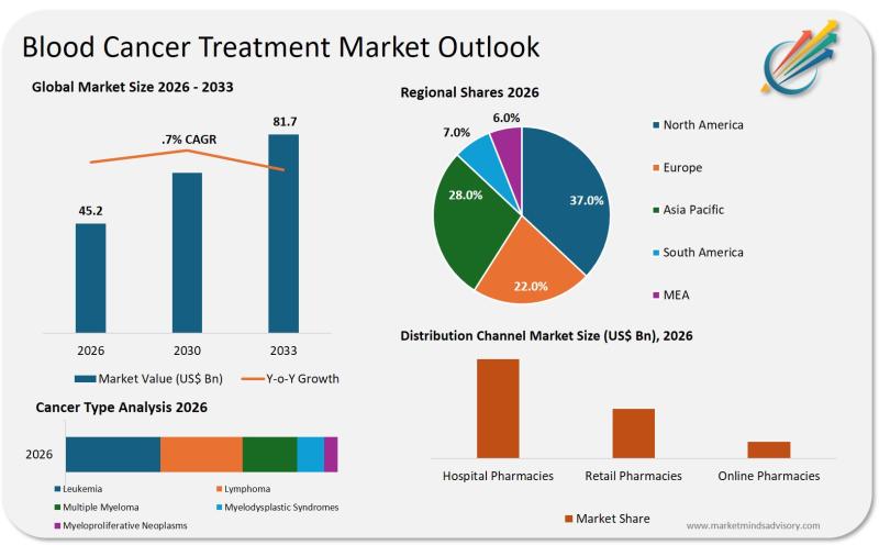 The blood cancer treatment market is positioned at a critical juncture, with a projected increase from USD 45.2 billion in 2026 to USD 81.7 billion by 2033, reflecting a robust CAGR of 8.7%, according to Market Minds Advisory. This growth trajectory is underpinned by rising global incidence rates of hematologic malignancies, ongoing advancements in immunotherapy and targeted drug development, and expanding patient access to novel treatments.…