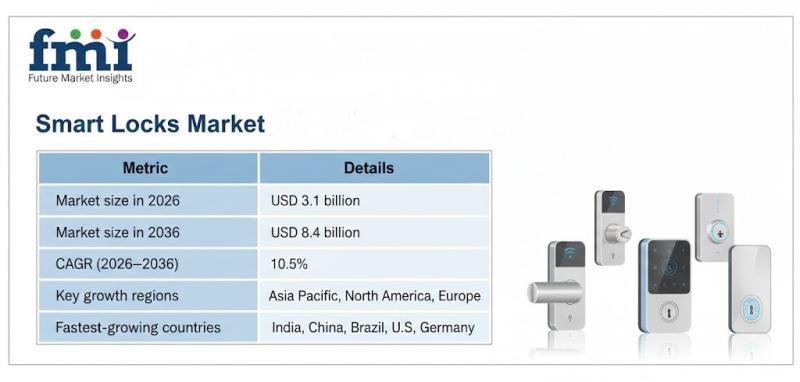 The global smart locks market is projected to grow significantly over the next decade, expanding from USD 3.1 billion in 2026 to USD 8.4 billion by 2036, registering a CAGR of 10.5%, according to the latest analysis by Future Market Insights (FMI). Growth is fueled by rising demand for keyless entry systems, integration with smart home ecosystems, and increasing requirements for remote access management across residential and commercial properties.