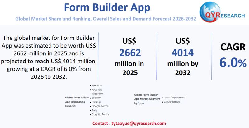 Global leading market research publisher QYResearch published the release of its latest report, "Form Builder App - Global Market Share, Ranking, Sales, and Demand Forecast 2026-2032". This in-depth report provides a complete analysis of the global Form Builder App market, offering critical insights into market size, share, demand, industry development status, and future forecasts. Whether you're a…