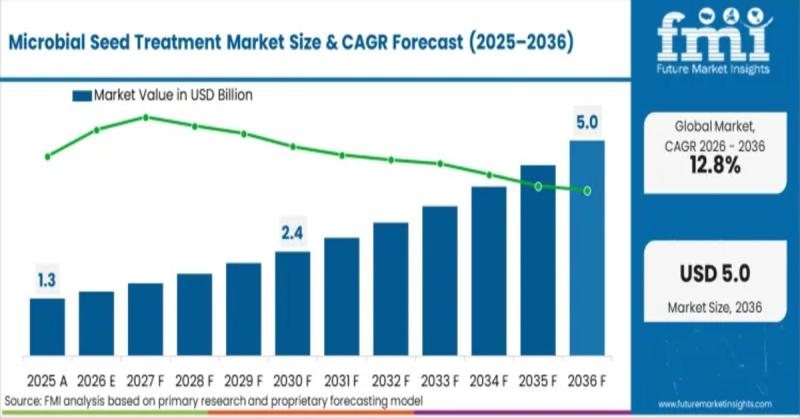 Microbial Seed Treatment Market OutlookThe global microbial seed treatment market is entering a decisive growth phase, reflecting a structural transformation in crop protection strategies worldwide. According to Future Market Insights (FMI), the market was valued at USD 1.3 billion in 2025 and is projected to reach USD 1.5 billion in 2026. Over the next decade, revenues are forecast to surge to USD 5.9 billion by 2036, expanding at a robust CAGR of 12.8%.