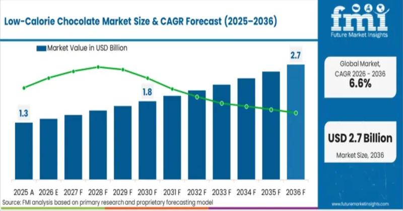 The global low-calorie chocolate market has crossed USD 1.3 billion in 2025 and is projected to reach USD 1.4 billion in 2026. According to Future Market Insights (FMI), the market is forecast to expand to USD 2.6 billion by 2036, registering a CAGR of 6.6% during 2026-2036.