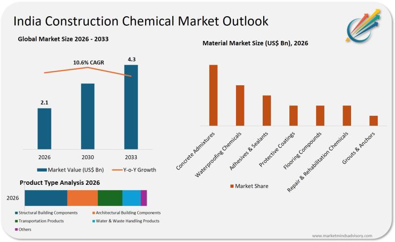 The India construction chemical market is currently positioned as a critical enabler within the nation's infrastructure and real estate sectors, valued at USD 2.1 billion in 2026. Market Minds Advisory's latest research underscores the sector's robust trajectory, with a projected compound annual growth rate (CAGR) of 10.6% through 2033, culminating in a market size of USD 4.3 billion. This expansion is driven by sustained public and…