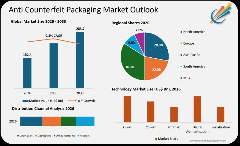 The anti counterfeit packaging market is positioned at a critical juncture, with a projected value of USD 283.7 billion by 2033, up from USD 152.4 billion in 2026, according to Market Minds Advisory. This robust expansion reflects heightened industry focus on product authentication, supply chain integrity, and brand protection across pharmaceuticals, food & beverage, electronics, and luxury goods sectors. The market's trajectory is shaped by the…