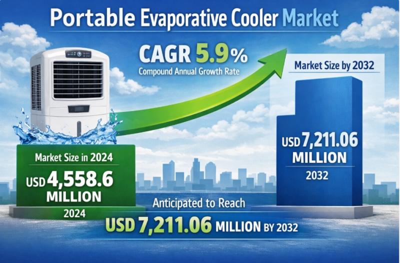 Portable Evaporative Cooler Market to Reach USD 7,211.06 Million by 2032 at a CAGR of 5.9%The Portable Evaporative Cooler Market is witnessing steady expansion as consumers and businesses increasingly seek cost-effective, energy-efficient, and environmentally friendly cooling alternatives. Valued at USD 4,558.6 million in 2024, the market is projected to reach USD 7,211.06 million by 2032, growing at a compound annual growth rate (CAGR) of 5.9% during the forecast period.