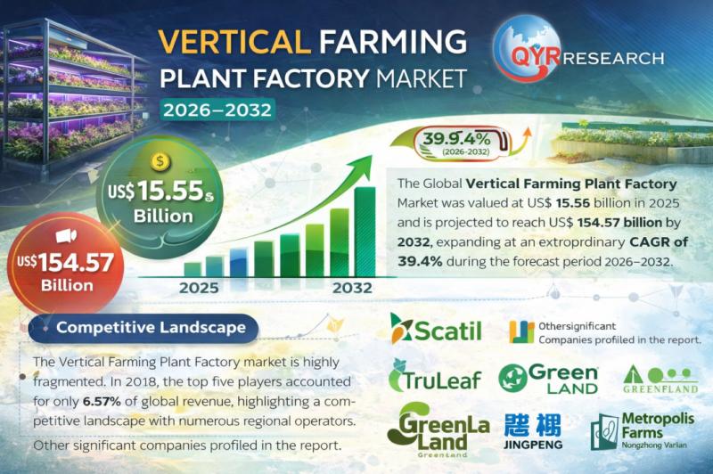 The Global Vertical Farming Plant Factory Market was valued at US$ 15.55 billion in 2025 and is projected to reach US$ 154.57 billion by 2032, expanding at an extraordinary CAGR of 39.4% during the forecast period 2026-2032. As arable land becomes scarce and urban populations grow, controlled-environment agriculture is emerging as a transformative solution for sustainable food production. Technological innovation, automation, AI-based crop monitoring, and water-efficient cultivation methods…