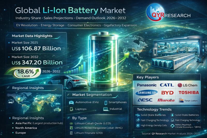 The Global Li-Ion Battery Market was valued at US$ 106.87 billion in 2025 and is projected to reach US$ 347.20 billion by 2032, registering a strong CAGR of 18.6% during the forecast period 2026-2032. Lithium-ion batteries remain the backbone of modern electrification, powering electric vehicles (EVs), energy storage systems (ESS), smartphones, laptops, and industrial applications. The market is highly concentrated, with the top twelve manufacturers accounting for approximately…