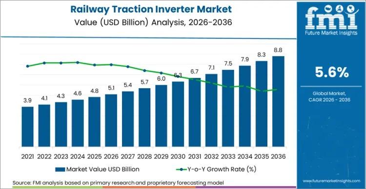 The global railway traction inverter market is entering a decisive expansion cycle, projected to grow from USD 5.1 billion in 2026 to USD 8.8 billion by 2036, advancing at a CAGR of 5.6%, according to the latest analysis by Future Market Insights (FMI). Growth is structurally anchored in accelerated railway electrification programs, high-speed rail investments, and large-scale rolling stock replacement across both mature and emerging economies.