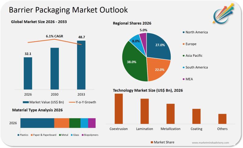The barrier packaging market is currently positioned as a critical enabler of product integrity and shelf-life extension across food, pharmaceuticals, and industrial applications. With a market size of USD 32.1 billion in 2026, the sector is experiencing robust growth driven by heightened consumer awareness of food safety, increasing regulatory scrutiny, and the proliferation of global supply chains. Core technologies such as multi-layer films, advanced coatings, and active…
