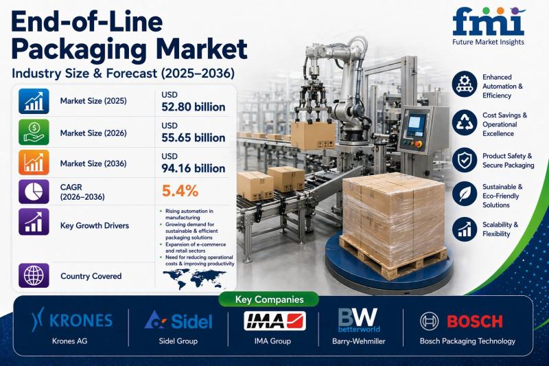According to latest analysis by Future Market Insights, the global end-of-line packaging market is projected to grow from USD 55.65 billion in 2026 to USD 94.16 billion by 2036, expanding at a CAGR of 5.4%. Growth is primarily driven by rising automation adoption, increasing e-commerce fulfilment volumes, and labor shortages across manufacturing and logistics operations.
