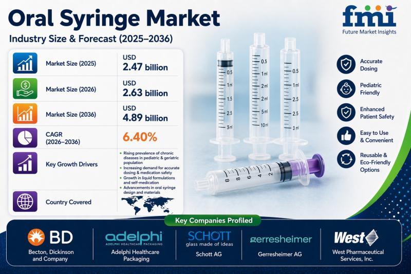 According to latest insights by Future Market Insights, the global oral syringe market is projected to grow from USD 2.63 billion in 2026 to USD 4.89 billion by 2036, expanding at a CAGR of 6.40%. Growth is being driven by increasing emphasis on patient safety, rising pediatric and geriatric populations, and regulatory mandates requiring accurate medication dosing devices.