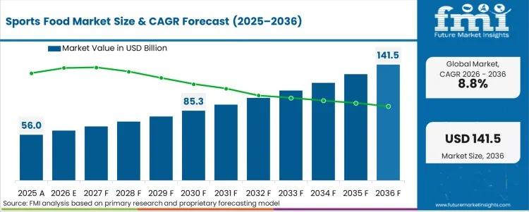 The global sports food market continues its robust upward trajectory, reflecting a decisive shift toward performance-focused, clean-label nutrition. In 2025, the market surpassed a valuation of USD 56.0 billion. According to Future Market Insights (FMI), demand is projected to rise to USD 60.9 billion in 2026 and accelerate to USD 141.9 billion by 2036, registering a CAGR of 8.8% during the forecast period.