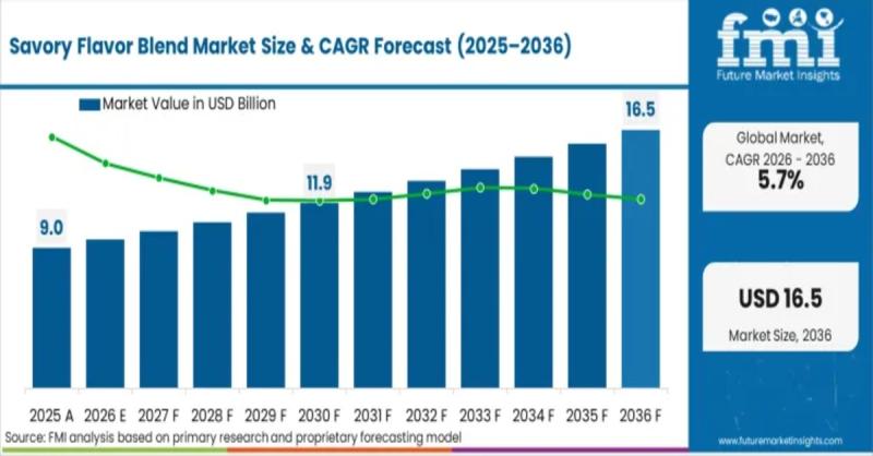The global savory flavor blend market has crossed USD 8.9 billion in 2025 and is projected to reach USD 9.5 billion in 2026, advancing to USD 16.5 billion by 2036, according to the latest analysis by Future Market Insights (FMI). The projected 5.7% CAGR between 2026 and 2036 reflects not incremental demand, but structural transformation across industrial food manufacturing.