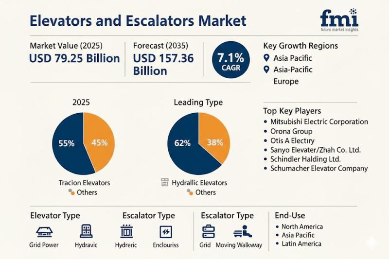 The global elevators and escalators market is projected to grow from USD 79.25 billion in 2025 to USD 157.36 billion by 2035, reflecting a compound annual growth rate (CAGR) of 7.1%. This expansion is primarily driven by rapid urbanization, high-rise construction, and smart city initiatives across Asia-Pacific, the Middle East, and Latin America.