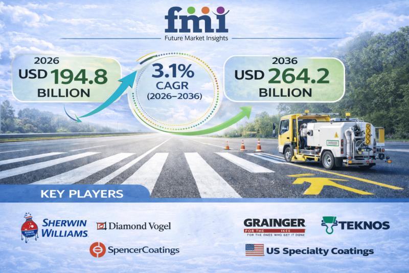 The global Marking Coating Market was valued at USD 188.9 billion in 2025 and is projected to reach USD 194.8 billion in 2026. According to analysis by Future Market Insights (FMI), the market is forecast to expand to approximately USD 264.2 billion by 2036, registering a CAGR of 3.1% during the 2026-2036 period.